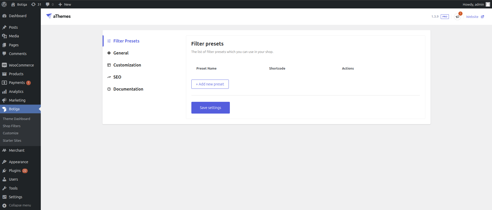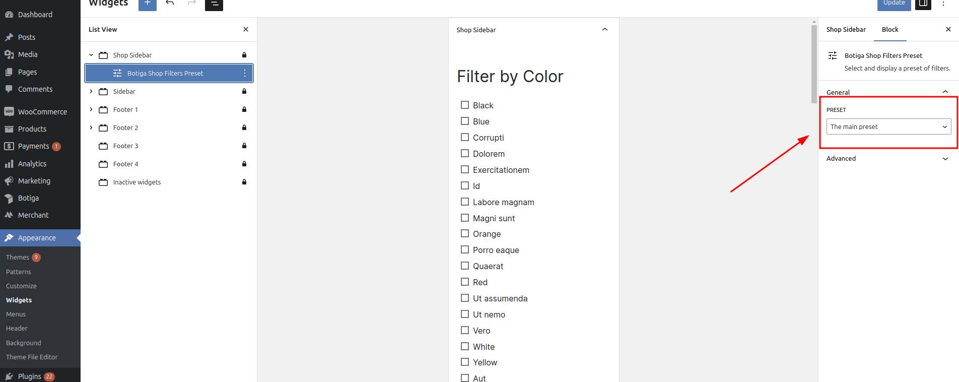 To display the filters in the frontend you have to add the Botiga Product Filters Preset block widget under Admin > Appearance > Widgets. Once you are in the page, select the sidebar where you want to display the widget and add it: