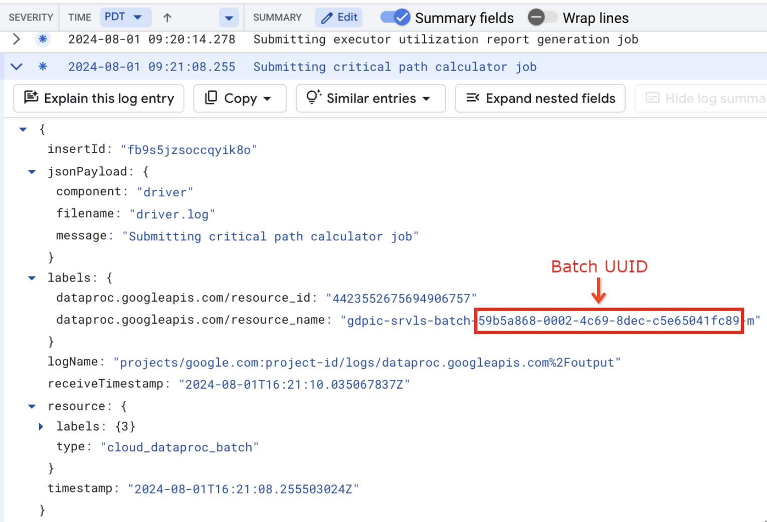 Notes:resource.type="cloud_dataproc_batch" labels."dataproc.googleapis.com/resource_name"="gdpic-srvls-batch-BATCH_UUID-VM_SUFFIX"