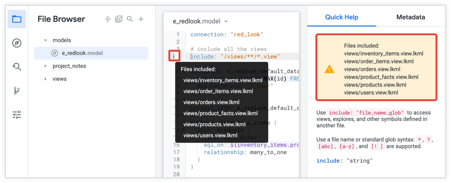 *wildcard character to include all files in a directory. For example, you can include all view files in theviews/users/directory by specifyinginclude: "/views/users/*.view". See the documentation page on IDE folders for more information on using wildcards with IDE folders.
