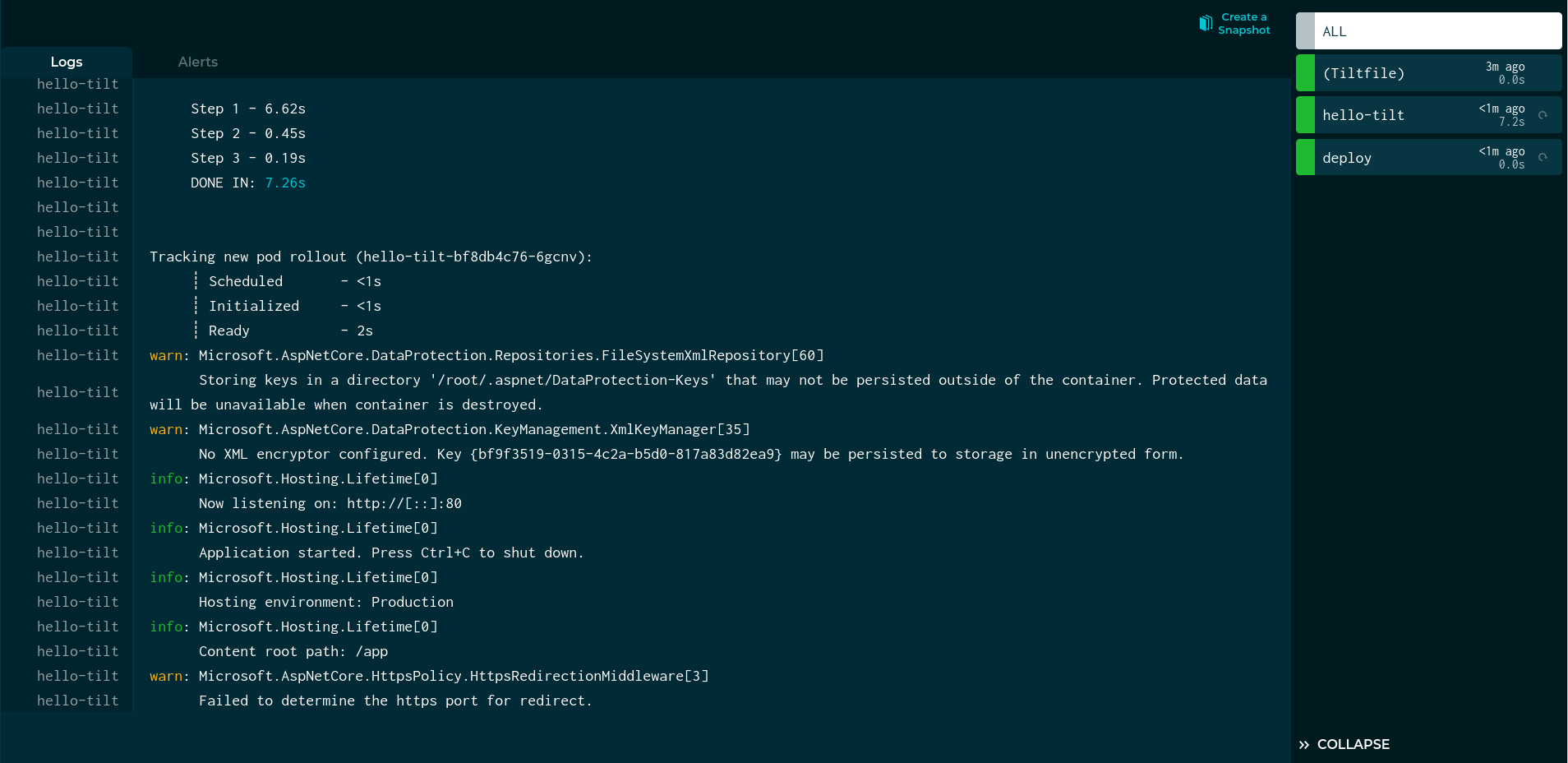If you look closely, the elapsed time displayed in the Tilt sidebar is different than the benchmark our app logged. That’s OK! In microservice development there are many benchmarks we care about – the time to build the image, the time to schedule the process, and the time until the server is ready to serve traffic.