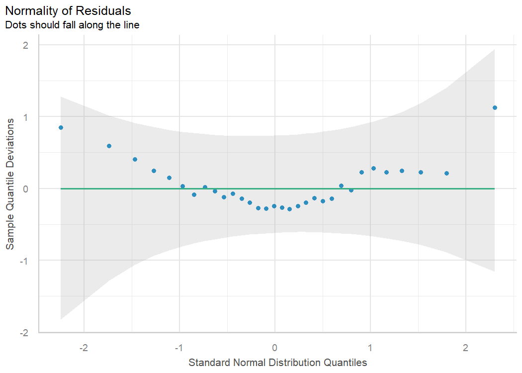 The performance package is primarily concerned with checking regression model assumptions (Lüdecke et al., 2021). The see package offers tools to visualize these assumption checks, such as the normality of residuals. Users simply pass the fit model object to the relevant performance function (check_normality() in the example below). Then, this result can be passed to plot() to produce a ggplot2 visualization of the check on normality of the residuals.