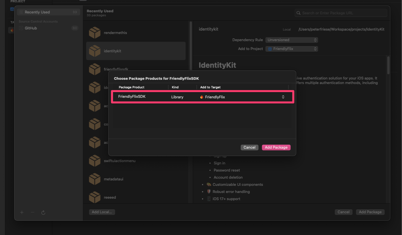 FriendlyFlixSDKpackage from theFriendlyFlix/appfolder - Wait for Xcode to resolve the package dependencies.