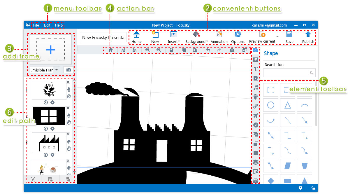 After you create a new project, you will be direct to the main interface where you can design, customize and publish the presentation. The main interface includes 6 sections: menu toolbar, convenient buttons, add frame, action bar, element toolbar and edit path.
