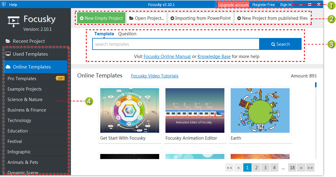 When you run Focusky, you will see the start interface where you can start a new project. Focusky provides 5 ways to create new the presentation project: new empty project, open project, import from PowerPoint file, open from published file and pre-designed templates.