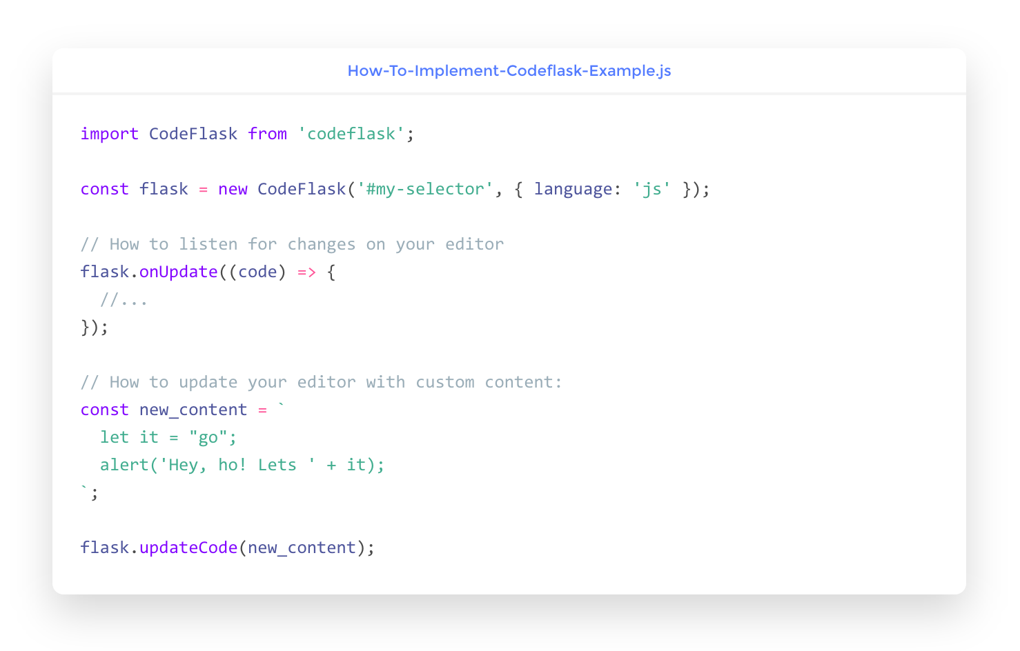 flask.updateCode('const my_new_code_here = "Blabla"');const code = flask.getCode();import CodeFlask from 'codeflask';