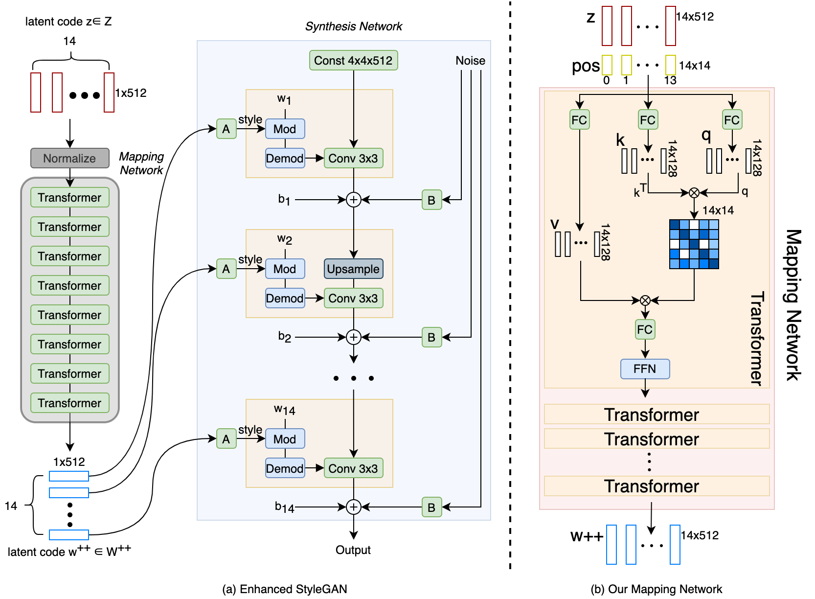 (a) Model overview. While the original StyleGAN feeds the same style code to each convolution layer, we redesign the architecture of the StyleGAN mapping network using Transformer so that different style codes are provided to different layers. We illustrate the structure for resolution at 256x256.