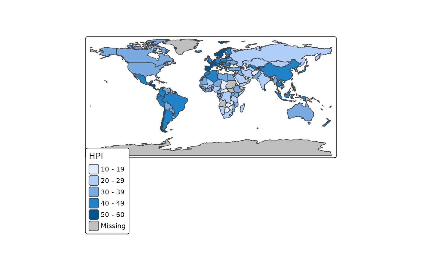 tm_shape(World) + tm_polygons("HPI")