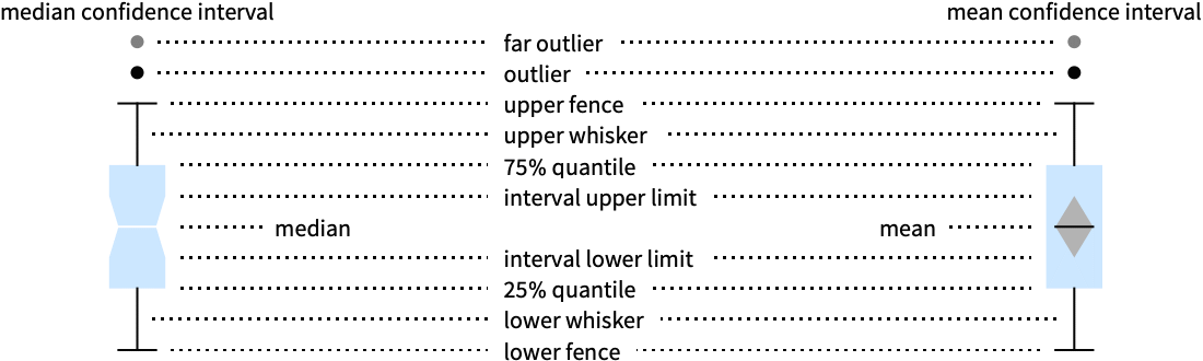 {"Fences",width,style} width and style of fences {"MeanDiamond",width,style} width and style of mean confidence interval {"MeanMarker",width,style} width and style of mean marker line {"MedianNotch",width,style} width and style of median confidence interval {"MedianMarker",width,style} width and style of median marker line {"Outliers",marker,style} marker symbol and style for outliers {"FarOutliers",marker,style} marker symbol and style for far outliers {"Whiskers",style} style for whiskers - The width is given as a fraction of the width of the box, and the marker can be any expression.