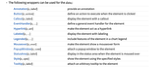 Annotation[e,label] provide an annotation Button[e,action] define an action to execute when the element is clicked Callout[e,label] display the element with a callout EventHandler[e,…] define a general event handler for the element Hyperlink[e,uri] make the element act as a hyperlink Labeled[e,…] display the element with labeling Legended[e,…] include features of the element in a chart legend Mouseover[e,over] make the element show a mouseover form PopupWindow[e,cont] attach a popup window to the element StatusArea[e,label] display in the status area when the element is moused over Style[e,opts] show the element using the specified styles Tooltip[e,label] attach an arbitrary tooltip to the element - In BoxWhiskerChart, Labeled and Placed allow the following positions: