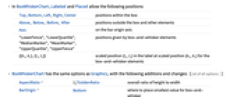 Top,Bottom,Left,Right,Center positions within the box Above, Below, Before, After positions outside the box and other elements Axis on the bar origin axis "LowerFence","LowerQuartile","MedianMarker","MeanMarker","UpperQuartile","UpperFence" positions given by box-and-whisker elements {{bx,by},{lx,ly}} scaled position {lx,ly} in the label at scaled position {bx,by} for the box-and-whisker elements - BoxWhiskerChart has the same options as Graphics, with the following additions and changes: [List of all options]
