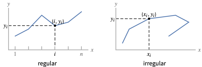 - Irregular data {{x1,y1},…,{xn,yn}} is plotted as the free-form curve through the points {xi,yi}.