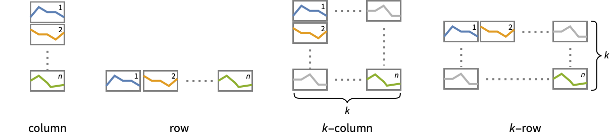 "Column" use separate curves in a column of panels "Row" use separate curves in a row of panels {"Column",k},{"Row",k} use k columns or rows {"Column",UpTo[k]},{"Row",UpTo[k]} use at most k columns or rows - Possible highlighting effects for Highlighted and PlotHighlighting include:
