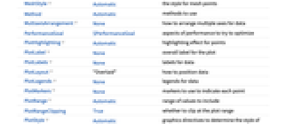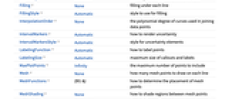 AlignmentPoint Center the default point in the graphic to align with AspectRatio 1/GoldenRatio ratio of height to width Axes True whether to draw axes AxesLabel None axes labels AxesOrigin Automatic where axes should cross AxesStyle {} style specifications for the axes Background None background color for the plot BaselinePosition Automatic how to align with a surrounding text baseline BaseStyle {} base style specifications for the graphic ClippingStyle None what to draw when lines are clipped ColorFunction Automatic how to determine the coloring of lines ColorFunctionScaling True whether to scale arguments to ColorFunction ContentSelectable Automatic whether to allow contents to be selected CoordinatesToolOptions Automatic detailed behavior of the coordinates tool DataRange Automatic the range of x values to assume for data Epilog {} primitives rendered after the main plot Filling None filling under each line FillingStyle Automatic style to use for filling FormatType TraditionalForm the default format type for text Frame False whether to put a frame around the plot FrameLabel None frame labels FrameStyle {} style specifications for the frame FrameTicks Automatic frame ticks FrameTicksStyle {} style specifications for frame ticks GridLines None grid lines to draw GridLinesStyle {} style specifications for grid lines ImageMargins 0. the margins to leave around the graphic ImagePadding All what extra padding to allow for labels etc. ImageSize Automatic the absolute size at which to render the graphic InterpolationOrder None the polynomial degree of curves used in joining data points IntervalMarkers Automatic how to render uncertainty IntervalMarkersStyle Automatic style for uncertainty elements LabelingFunction Automatic how to label points LabelingSize Automatic maximum size of callouts and labels LabelingTarget Automatic how to determine automatic label positions LabelStyle {} style specifications for labels MaxPlotPoints Infinity the maximum number of points to include Mesh None how many mesh points to draw on each line MeshFunctions {#1&} how to determine the placement of mesh points MeshShading None how to shade regions between mesh points MeshStyle Automatic the style for mesh points Method Automatic methods to use MultiaxisArrangement None how to arrange multiple axes for data PerformanceGoal $PerformanceGoal aspects of performance to try to optimize PlotFit None how to fit a curve to the points PlotFitElements Automatic fitted elements to show in the plot PlotHighlighting Automatic highlighting effect for points PlotInteractivity $PlotInteractivity whether to allow interactive elements PlotLabel None overall label for the plot PlotLabels None labels for data PlotLayout "Overlaid" how to position data PlotLegends None legends for data PlotMarkers None markers to use to indicate each point PlotRange Automatic range of values to include PlotRangeClipping True whether to clip at the plot range PlotRangePadding Automatic how much to pad the range of values PlotRegion Automatic the final display region to be filled PlotStyle Automatic graphics directives to determine the style of each line PlotTheme $PlotTheme overall theme for the plot PreserveImageOptions Automatic whether to preserve image options when displaying new versions of the same graphic Prolog {} primitives rendered before the main plot RotateLabel True whether to rotate y labels on the frame ScalingFunctions None how to scale individual coordinates TargetUnits Automatic units to display in the plot Ticks Automatic axes ticks TicksStyle {} style specifications for axes ticks