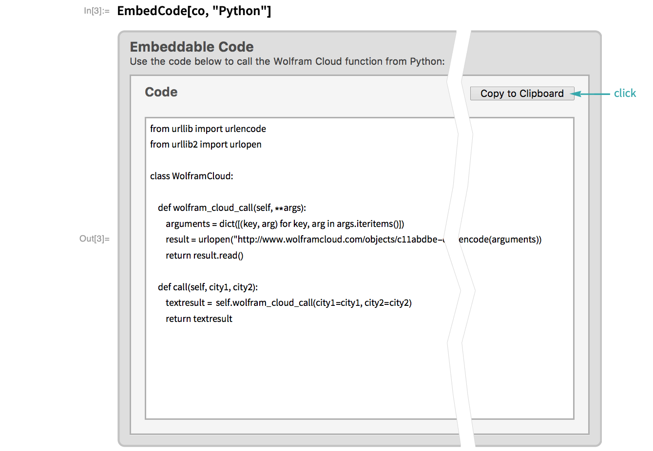 Create an APIFunction that returns the distance between two cities. In this example, TravelDistance returns a Quantity. Applying QuantityMagnitude to that result extracts just the numeric value, which is easier for an external program to process than a Quantity: