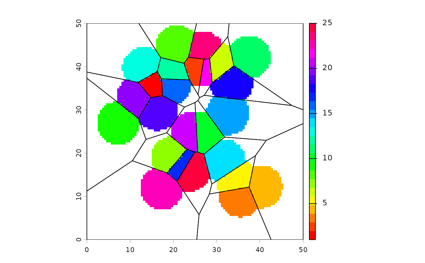 # plot(v, col=rainbow(25)); points(p)