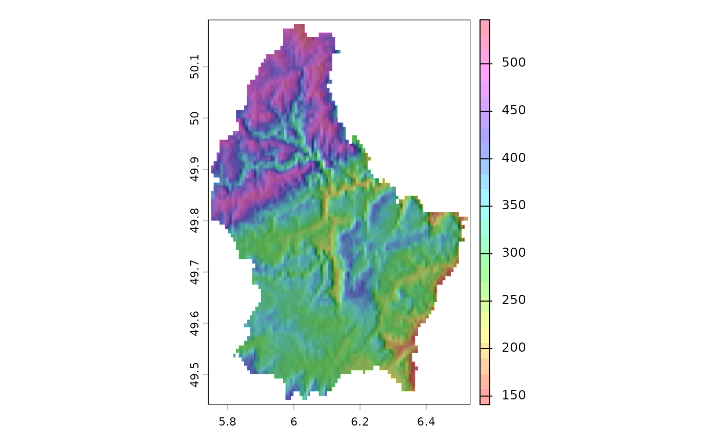 shade.RdCompute hill-shade from slope and aspect layers (both in radians). Slope and aspect can be computed with function terrain.
