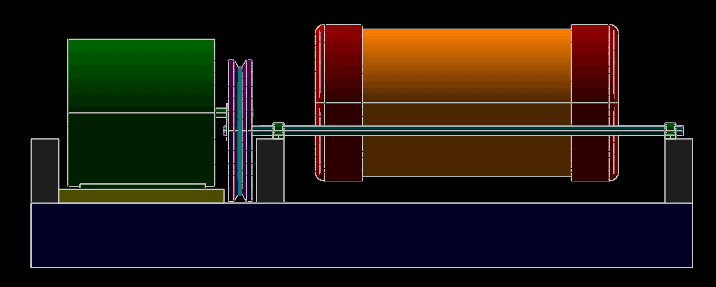 A belt-driven ball mill. The images above are a mixture of parallel projections, as for the top and side views, and perspective projections for the pictorials. All were generated directly from the 3d model.