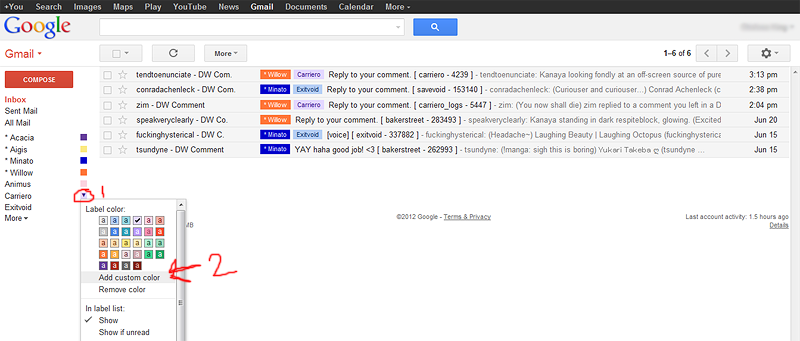 9. Back at your inbox, there should be your new label on the left hand column, with a little colored box next to it. Click on that box, and a menu will appear with some color options. You can also use "Add custom color" to make up some additional colors.