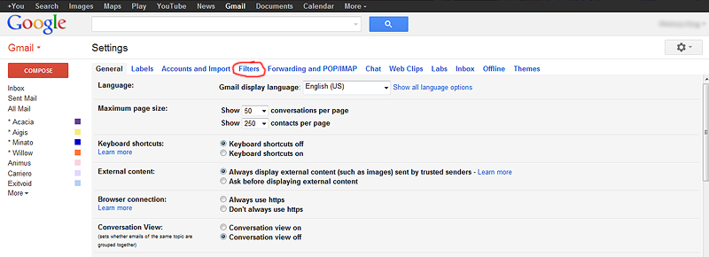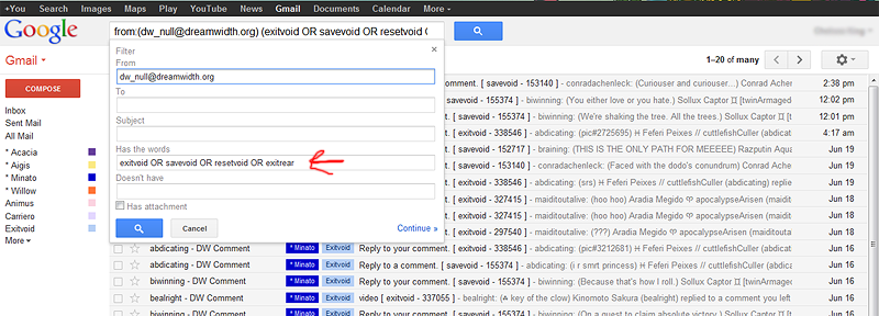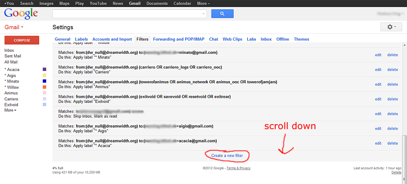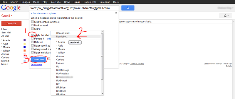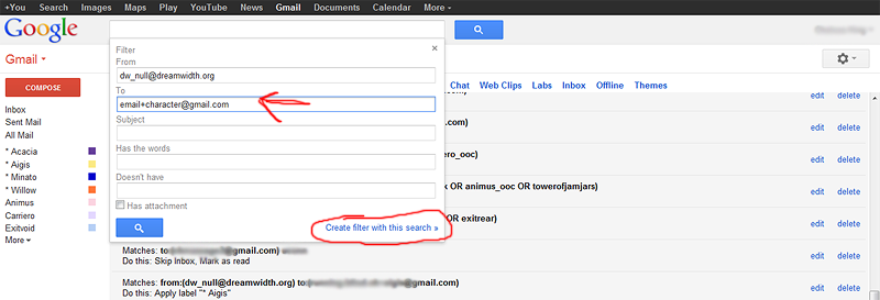 dormition, so I might make the address associated with his account email+minato@gmail.com or email+dormition@gmail.com. It doesn't matter what comes after the + as long as it's unique and you don't repeat it elsewhere. If you have more than one journal for the same character and want them all to get the same label, you can give them the same email+character@gmail.com address and only use one filter.