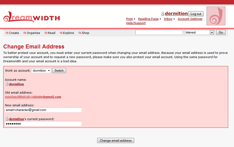 3. Now you're going to change your email address to email+character@gmail.com. Why are we doing this? Anything after the + will be ignored when emails are sent to you; therefore, your email might be email@gmail.com, but anything sent to email+jayne@gmail.com, email+inara@gmail.com, and so forth will all go to the same initial account, email@gmail.com. It's critical to include here that the part that will be ignored is after the plus sign, not before it, and if you get these sides mixed up, you will cease receiving email for that account.