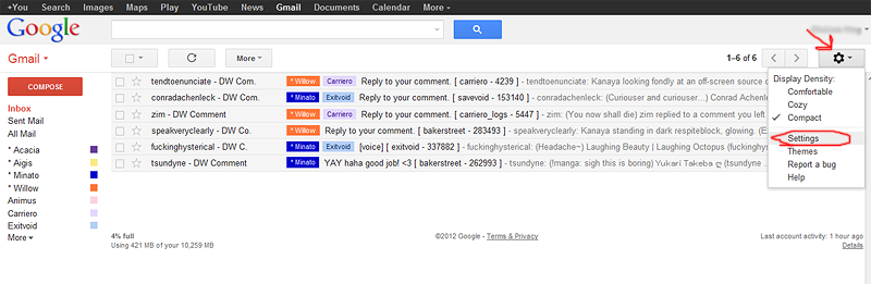 4. Log into your Gmail account. Click on the little gear symbol in the upper right hand corner and select Settings.