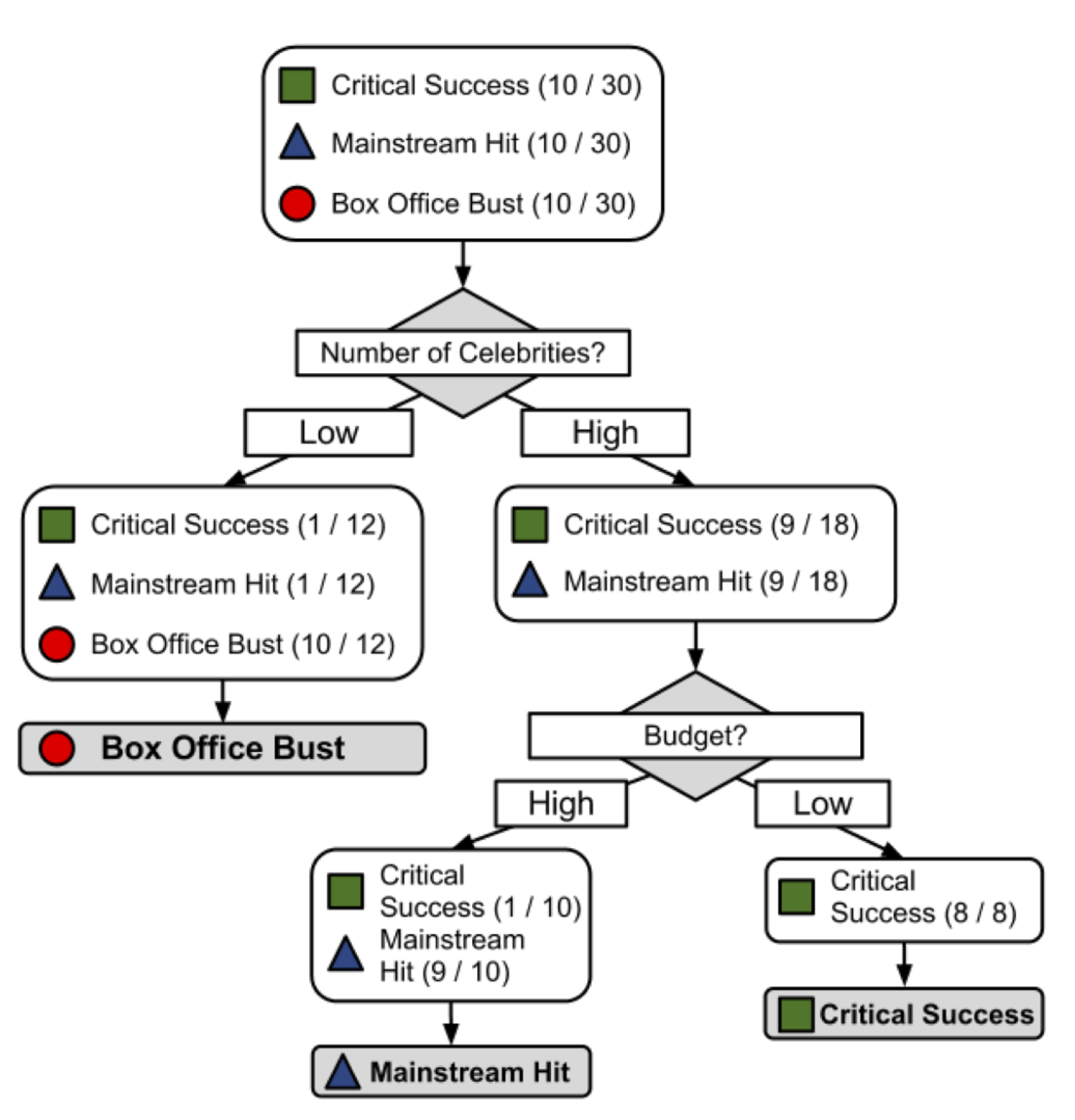 Para ilustrar el proceso de construcción del árbol, consideremos un ejemplo simple. Imagine que está trabajando para un estudio de cine de Hollywood, y su escritorio está repleto de guiones. En lugar de leer cada uno de principio a fin, usted decide desarrollar un algoritmo de árbol de decisión para predecir si una película potencial podría clasificarse en una de tres categorías: