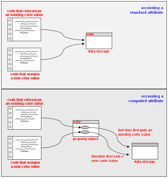 The easiest way to implement a computed attribute is with an object of type property, introduced in Python 2.2. Depending on the way you access a property object, it dispatches a function to perform either a "get the value" operation or a "set the value" operation (or even "delete the attribute"). You specify the dispatch functions when you create the property object; it's up to you to ensure that the work they do makes sense. The following diagram illustrates how a property works.